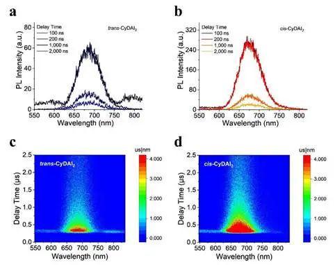 图6. (a) tran-CyDAI2。(b)cis-CyDAI2钝化后钙钛矿薄膜的时间分辨荧光光谱。(c) tran-CyDAI2。(d) cis-CyDAI2钝化后钙钛矿薄膜的2D时间分辨荧光光谱。