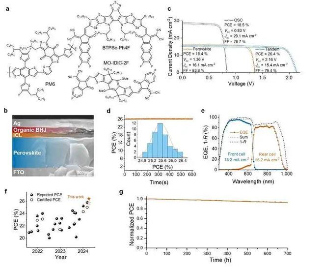 图4. a) 有机光伏层中使用的材料化学结构。b)截面SEM图像。c) J-V曲线。d) 最大功率点跟踪。e) EQE曲线。f) 钙钛矿/有机叠层太阳电池的光伏性能摘要。g) 钙钛矿/有机叠层太阳电池进行连续MPP跟踪。