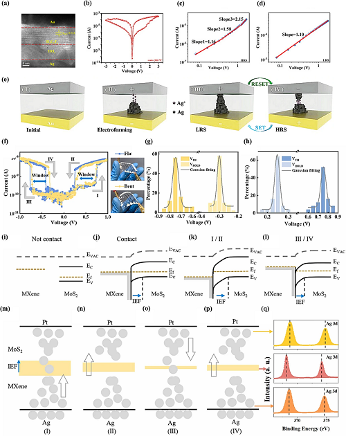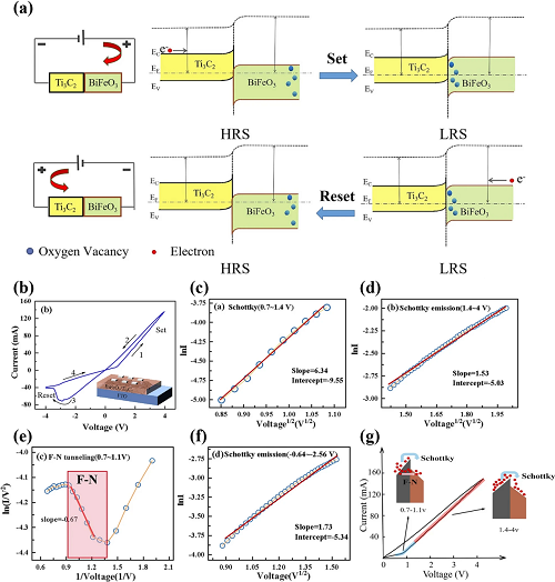 ECM器件采用银、铜等活性金属电极,其阻变机制依赖活性金属导电细丝(CF)的随机形成与断裂。例如,Huang等人开发了一种基于晶圆级TiO/MXene-TiCT异质结的忆阻器阵列(图3a)。通过对图3b中电流-电压曲线分析,表明高阻态符合空间电荷限制电流传导模型,低阻态则因银导电细丝形成呈现欧姆特性(图3c和图3d),这一结果与图3e中活性金属CF的模型特征相一致。进一步,Wang等人进一步提出了异质结调控导CF的物理模型,在Ag/MXene-TiCT/MoS/Pt器件中,MXene-TiCT与MoS功函数差异形成由MXene-TiCT指向MoS的内建电场(IEF),正/负扫描时IEF增强/减弱可精准调控银离子迁移。这些研究通过深入探索器件在开关过程中的物理机制,实现了导电细丝的可控调制,为高性能MXene-TiCT基神经形态器件的开发提供了新的路径。
