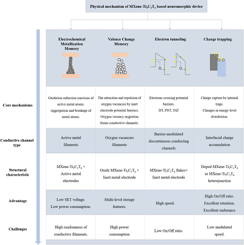 为了克服神经形态器件在可靠性和耐久性方面的瓶颈,研究人员从器件的开关机制角度入手,对电荷转移和开关过程的微观物理机制进行了探索,旨在实现稳定的电阻开关状态、长期的保持时间和高循环特性。同时,通过调控器件的微观结构,研究人员可以实现更可控的开关过程,从而进一步优化开关速度和能耗,为提高神经形态系统的性能,实现传感、存储和计算的一体化提供更大的支持。MXene-TiCT基神经形态器件的工作原理可分为三类:电化学金属化机制(ECM)、价态变化存储机制(VCM)、电子隧穿效应以及电荷捕获和释放效应。