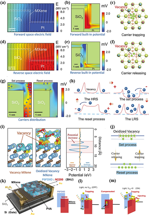 基于电荷捕获-释放机制的器件,需采用富含电荷陷阱的材料作为功能层。电荷被功能层内部缺陷捕获时,会改变材料能级分布,导致器件阻态切换。例如,Tan等人利用单层空位诱导的氧化MXene-TiCT构建了Al/VSC-MXene-TiCT /Pt/SiO/Si结构忆阻器。 SET过程(图7a-b)中,电场在MXene转角处发生畸变,压电效应产生内建电势,峰值集中于通道转角(图7g),引导载流子定向运动。该电势与氧空位缺陷相互作用,实现载流子捕获与释放。 RESET过程(图7d-f)中,反向电场产生逆向内建电势,使载流子脱离氧空位,器件返回HRS。 Gao等人(图7k-m)通过MXene-TiCT构建了一种垂直有机神经形态晶体管。光脉冲在POFDIID/N2200异质结中产生激子,电子被N2200陷阱捕获形成光电流,撤去光脉冲后电子-空穴复合体现短时记忆。这种光脉冲与栅压的协同调控进一步拓展了MXene基器件的光电神经形态功能,为高性能神经形态计算器件设计提供了新思路。
