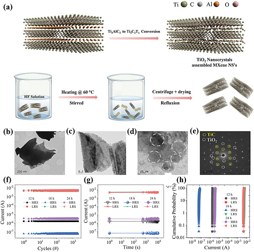 MXene-TiCT具有丰富的表面官能团和规则的原子结构排列,其表面可通过多种化学方法进行改性,以改变其物理结构并调节其电子特性。例如,Mullani 等研究者描述了一种利用氢氟酸进行可控蚀刻的技术,旨在实现对 MXene-TiCT纳米片表面的部分氧化。图 9a 展示了该方法及合成路线 °C 下用 HF 蚀刻 Ti3AlC2 获得多层MXene-TiCT,随后在 40 °C 下回流以促进氧化位点的形成。图9b-9d展示了MXene-TiCT纳米片内部TiO2纳米晶体的高清TEM图像。相应的晶体结构信息如图9e的SAED所示,其中沿(0001)轴可观察到TiO的六方排列结构,这表明钛氧化物纳米晶体的合成成功。这种具有部分氧化特性的MXene-TiCT器件表现出超过104次循环耐受性和104秒电阻保持特性(图9f-h)。这些结果表明,部分氧化MXene-TiCT忆阻器具有优异的电阻切换性能、良好的记忆保持能力和适用于高密度存储与突触学习应用的大记忆窗口。