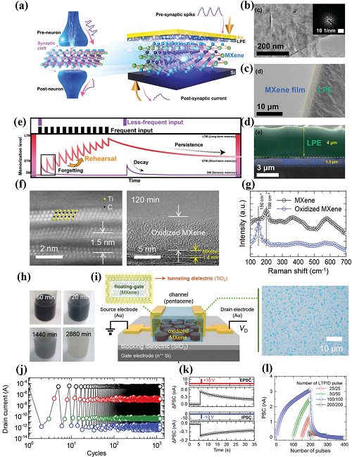 介电层的巧妙利用对于调节离子传输通道传输路径,制备高度稳定的神经形态器件中具有重要意义。作为屏障层,介电层显著减少了MXene-TiCT与外部环境的直接接触,有效抑制了环境干扰,从而大幅提升了忆阻器的长期稳定性和可靠性,例如通过优化关键性能指标,包括显著降低工作电压和增加电阻状态数量。通过介电层直接耦合技术,MXene-TiCT基神经形态器件展现出超低的相应电压(±80 mV)和低功耗特性(460 fW),如图12a-e所示。这显著拓展了神经形态器件的应用范围。除了介电层直接耦合外,介电层的全包裹耦合也是提升MXene-TiCT基忆阻器稳定性的关键方法。例如,Lyu等通过精确控制MXene的表面氧化过程,制备了MXene-TiO核壳纳米片。随后将这种MXene-TiO核壳纳米片夹在有机半导体层与SiO介质层之间,作为纳米浮栅晶体管存储器(NFGTM)的浮栅层和隧穿层。通过测试发现,当MXene-NFGTM器件的氧化层厚度达到6.2 nm的优化值时,器件可在1000次编程/擦除循环后无显著性能退化,表明其具有优异的操作耐久性(图12j),且单个脉冲尖峰的功耗仅为3.8 pJ。这一功耗水平接近人类大脑中生物突触的功耗,表明全包裹耦合可为提升人工突触器件的性能做出重要贡献。