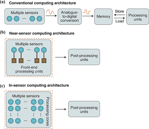 在传统计算机架构(图14a)中,模拟传感信号通过数模转换器(ADCs)转换为数字信号,存储在内存单元中,随后传输至中央处理器进行处理。这种依赖数据转换和传输路径的方法不可避免地导致高能耗和显著的响应延迟。相比之下,近传感器计算架构展现出显著优势。在此架构(图14b)中,处理单元部署在传感器附近,直接在传感器侧执行特定任务。这种设计不仅优化了传感器与处理单元之间的接口,还减少了不必要的数据传输量,从而根本上提升了系统效率。近内存计算架构通过在传感器附近部署处理单元,直接在传感器层面执行特定任务,从而优化系统效率。这种方法有效优化了接口设计并减少了冗余数据传输。其核心理念在于缩短计算单元与内存单元之间的物理距离,而非追求完全集成,通过压缩数据路径来最小化传输延迟和能耗。这使其特别适用于需要高频数据交互但对集成要求不高的场景。然而,传感器与处理器的空间分离导致该架构仍无法完全突破数据转换与传输链的物理限制,这在一定程度上制约了能效的进一步提升。此外,基于传感器内计算的架构开创了感知与计算深度协作的新范式(图14c)。通过在本地处理捕获的原始信息,借助自适应传感器或互联传感器网络,该架构突破了传感器与处理器之间的传统接口瓶颈,实现了物理感知与智能计算的无缝融合。凭借其高效的设备端数据处理能力,该架构在处理大规模并行计算任务和深度学习操作方面表现尤为出色。通过消除冗余数据传输,它显著提升了实时性能,从而为高性能计算、边缘计算等应用场景提供了更优解决方案。受此趋势启发,基于MXene-TiCT的忆阻器技术正迅速在内存计算领域崭露头角,为构建更高效、紧凑且响应迅速的感知与计算系统提供了新的物理基础和技术路径。