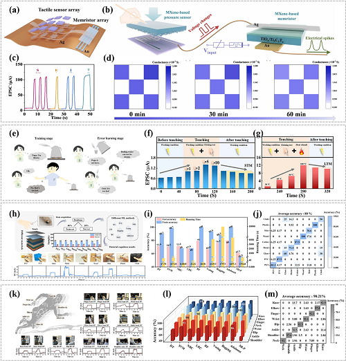 随着神经形态计算技术的快速发展,基于器件外模拟策略的多功能近传感器计算神经元和集成式传感器内计算设备正以前所未有的速度蓬勃发展,并在大规模神经形态传感器电路构建以及先进人机交互系统中展现出巨大的应用潜力和独特优势。这些创新技术不仅显著提升了数据处理效率和智能响应能力,更为实现更加自然高效的人机交互体验奠定了坚实基础。在触觉感知方面,全MXene-TiCT的柔性感觉神经元和基于MXene-TiCT的一体化仿生传入神经系统的构建使得传感到分析的直接映射成为可能,并实现了高精度摩斯密码,基于操作性条件反射的联想学习过程以及多模态触觉感知应用。
