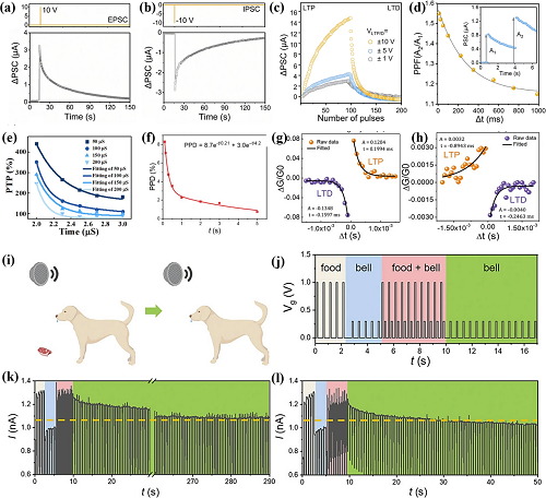 为了推动近传感器计算和传感器内计算技术的发展,研究人员对器件的核心功能进行了深入探索,并基于MXene-TiCT器件在电刺激下的工作原理,设计了多种实验方案,旨在模拟神经元突触间隙中Ca2的动态传输机制,从而实现感知、学习和记忆功能。这一过程不仅需要对生物神经传导原理有深刻理解,还需整合先进电子工程技术,旨在验证和优化设备在模拟突触可塑性及实现功能存储方面的潜力与可行性,为构建高度仿生神经形态计算系统提供有力支持。如图15所示,研究人员通过编辑器件的输入脉冲尖峰序列模式,在器件内实现了突触可塑性行为,突触权重的增强和抑制特性,脉冲时序依赖的可塑性,双脉冲易化等生物突触的基本特性,并结合器件的长期记忆特性模拟了巴布洛夫狗的条件反射现象。这些实验结果凸显了基于MXene-TiCT的人工突触设备在模拟复杂认知过程(包括学习和记忆)方面的可行性。