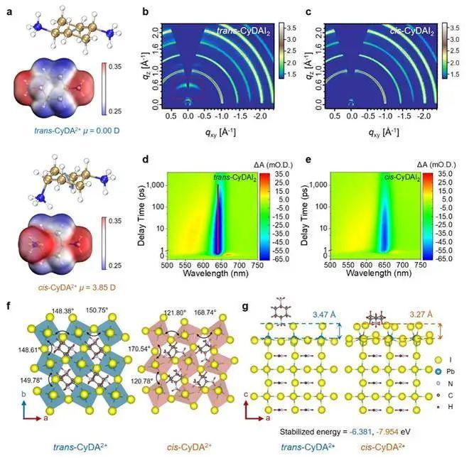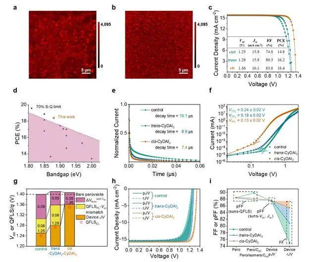 trans-CyDAI2钝化后的钙钛矿薄膜在激发后,主要的基态漂白峰(GSB)从630 nm逐渐红移到650 nm,这种红移表明,一部分激发态能量从具有更宽带隙的表面Dion–Jacobson二维钙钛矿转移到体相三维钙钛矿,造成能量损失,不利于提升开路电压。相比之下,在经cis-CyDAI2处理的钙钛矿薄膜中,没有出现明显的GSB峰偏移,表明其薄膜中没有出现二维钙钛矿结构,说明其钝化效果更好,能够有效减少界面和体相复合,提高电池性能。