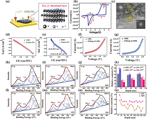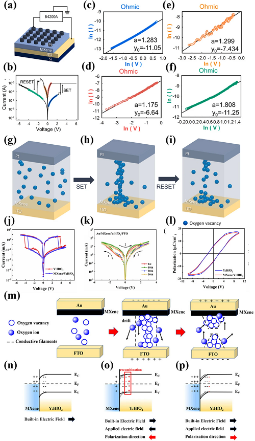 VCM器件依赖功能层内活性原子化学价态变化形成氧空位非金属导电细丝。例如,Feng等人报道了一种具有Pt/氧化MXene-TiCT/ITO结构的忆阻器(图4a)。通过电流-电压曲线b-f)揭示其阻变机理,发现高阻态符合欧姆定律,低阻态在0.765V至-0.025V区间呈线性传导,这与VCM特性相一致。如图4g-i所示,施加正电压时顶部电极附近氧离子迁移产生氧空位(Vo),在电场驱动下向底电极聚集形成导电细丝,负电压则促使氧离子被顶电极捕获导致细丝断裂。Fang等人报道一种基于Au/MXene/Y:HfO2/FTO结构的双模态(模拟和数字类型)MXene-TiCT基铁电忆阻器,并通过能带理论解释了数字类型下VCM机制的产生原因,认为铁电极化方向与内建电场一致时将促进氧空位迁移形成CF。