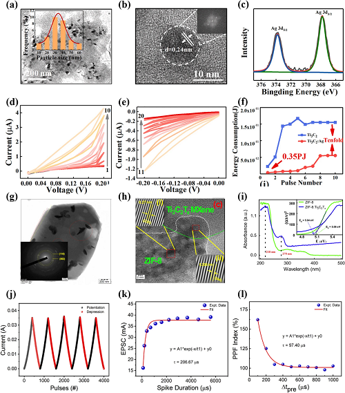 通常,忆阻器中导电通道的形成往往伴随着较大的随机性,导致器件在设置过程中容易出现不稳定现象,从而影响其耐久性和重复性。因此,标准化导电通道的形成路径,以确保器件能够展现出稳定且可控的电气特性尤为重要。很多研究人员致力于探索创新的方法和策略,以实现对器件CF的精确调控。例如,Yan等提出了一种银纳米颗粒掺杂法来提升基于MXene-TiCT 忆阻器的电学性能。图11a-11c展示了Ag掺杂的MXene-TiCT纳米片的TEM和XPS图像,验证了Ag纳米颗粒的成功掺杂。进一步通过测试发现,与AlMXene-TiCT /Pt器件相比,Al/MXene-TiCT:Ag/Pt器件展现出可控的双向连续电阻切换行为(图11d和11e),且在单脉冲尖峰条件下能耗仅为0.35 pJ(图11f)。该研究提供了一种简便方法来提升MXene-TiCT忆阻器的类脑特性,这将显著推动二维材料在类脑芯片领域的多元化应用,并大幅提升MXene-TiCT材料的实用性。