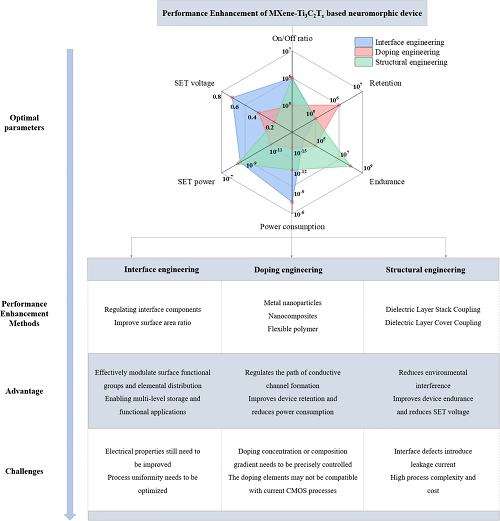 2.本综述概述了提升MXene-TiCT 神经形态器件的三种关键工程策略:包括掺杂工程、界面工程和结构工程,同时还为材料和器件改进提供了指导。