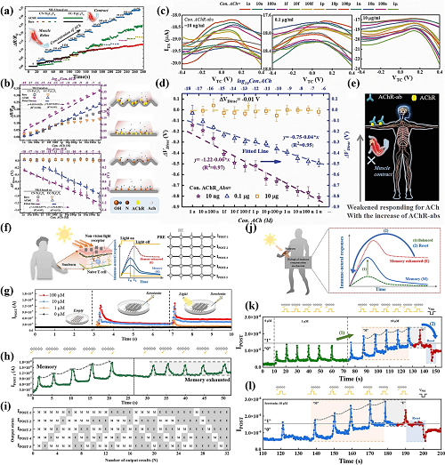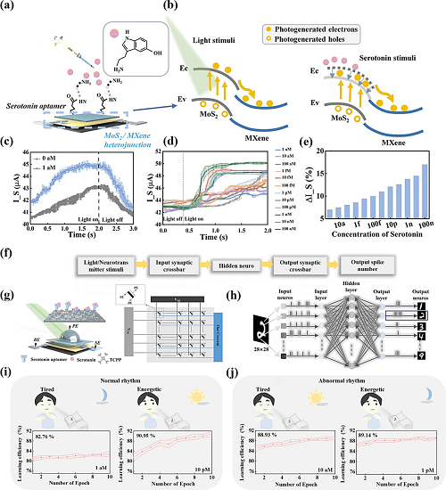 神经学研究表明,人类的学习和记忆活动具有昼夜节律的特征,而视网膜传入神经系统(OANS)在维持昼夜节律中发挥着关键作用。这种仿生模拟OANS功能有助于实现传感器内计算应用的多模态发展。Wang等研究者报道了一种基于MXene-TiCT/MoS异质结的OANS器件,以实现光和化学等多模态信号的联合调控特性。实验方案如图19所示,研究人员将5-羟色胺(5-HT)特异性适体交联于TCPP修饰的MoS/MXene异质结表面。利用神经递质浓度调控异质结能带弯曲。实验证实当5-HT浓度从0增至1 aM时,相同光强下突触电流显著上移(图19c),且器件电阻态可受神经递质浓度精确调控(图19d和19e)。最后该研究通过构建器件感知外部刺激,脉冲神经网络(SNN)处理和类脑分析输出识别结果(图19f-19h)这一系统流程,成功模拟了生物节律的学习能力(图19i和19j)。这一突破为开发具备环境自适应能力的多模态传感内计算系统提供了新范式。