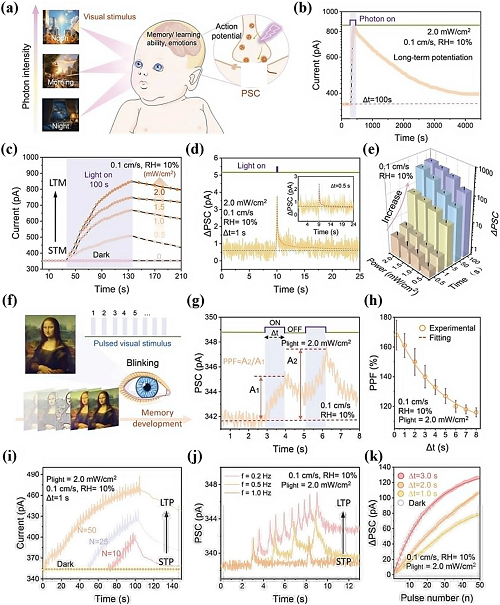 为推进多模态传感内计算技术,研究者聚焦光学信号的感知与记忆技术,旨在实现光信号的高效传输与处理,为多模态信息融合分析开辟新途径。Tan等研究者报道了一种基于单层氧化MXene-TiCT的视觉-呼吸突触器件 (VRSOM),持续光照(100秒)可诱导超过4000秒的长时程增强(图18b),并成功模拟了突触后电流(PSC)从短时程可塑性(STP)转为LTP(图18c),以及视觉交互中的记忆形成(图18f)、双脉冲易化(PPF)(图18g,h)以及刺激次数(N)依赖的短时记忆(STM)向长时记忆(LTM)转换(图18i)。为交互式光子突触与人工系统发展奠定基础。同时也表明基于MXene-TiCT的光学突触器件研究取得了显著突破,为开发新型神经形态光电系统与发展高效的多模态传感内计算技术提供了重要的实现路径和创新方法。