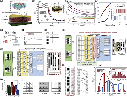 为了推动近传感器计算和传感器内计算技术的发展,研究人员对器件的核心功能进行了深入探索,并基于MXene-TiCT器件在电刺激下的工作原理,设计了多种实验方案,旨在模拟神经元突触间隙中Ca2的动态传输机制,从而实现感知、学习和记忆功能。这一过程不仅需要对生物神经传导原理有深刻理解,还需整合先进电子工程技术,旨在验证和优化设备在模拟突触可塑性及实现功能存储方面的潜力与可行性,为构建高度仿生神经形态计算系统提供有力支持。如图15所示,研究人员通过编辑器件的输入脉冲尖峰序列模式,在器件内实现了突触可塑性行为,突触权重的增强和抑制特性,脉冲时序依赖的可塑性,双脉冲易化等生物突触的基本特性,并结合器件的长期记忆特性模拟了巴布洛夫狗的条件反射现象。这些实验结果凸显了基于MXene-TiCT的人工突触设备在模拟复杂认知过程(包括学习和记忆)方面的可行性。