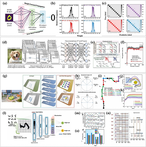 目前,由于忆阻器具有非易失性和高度集成的特点,因此可应用于大规模类脑计算。因此,许多研究采用基于忆阻器的神经网络模拟来验证其在硬件设计中的可行性。多组研究通过不同MXene-TiCT基神经形态器件,在图像识别(MNIST/CIFAR-10)、路径识别及旋转数字多任务处理中实现高精度(87.5%~96.44%)与强抗噪性,证实其在神经形态硬件(尤其是高集成突触阵列与感算一体系统)中的实用潜力。